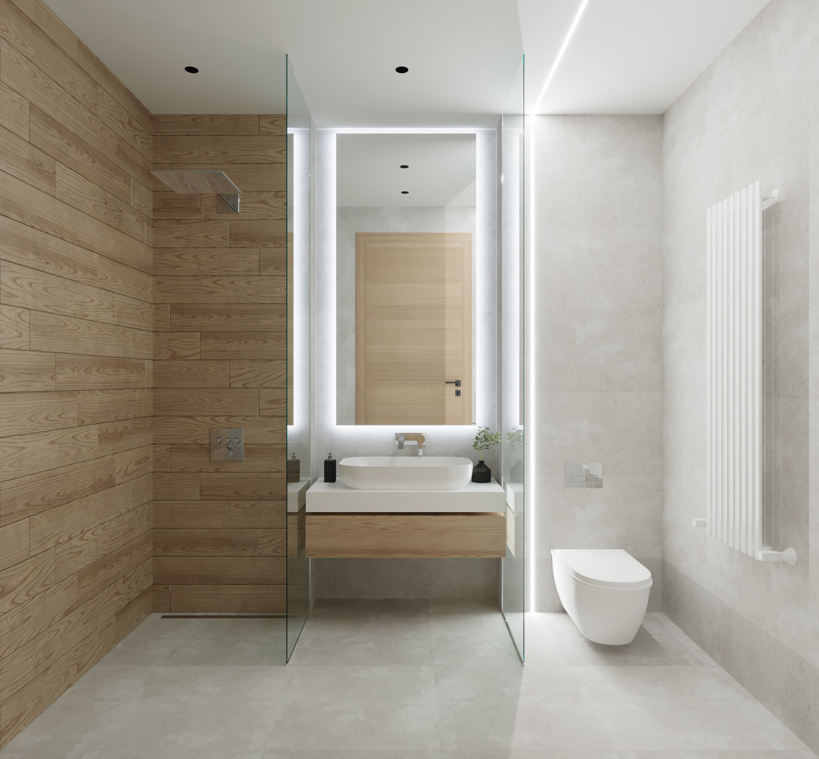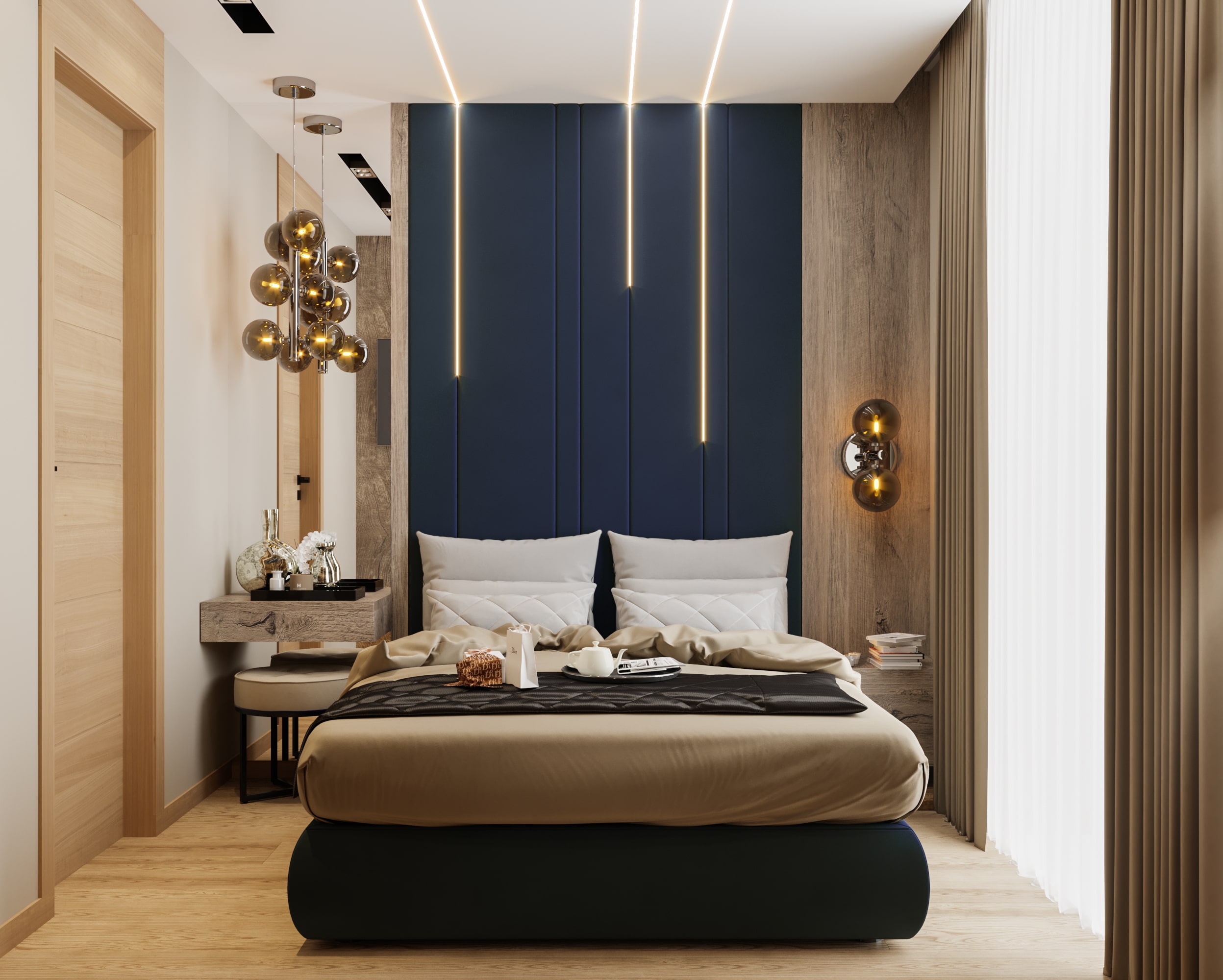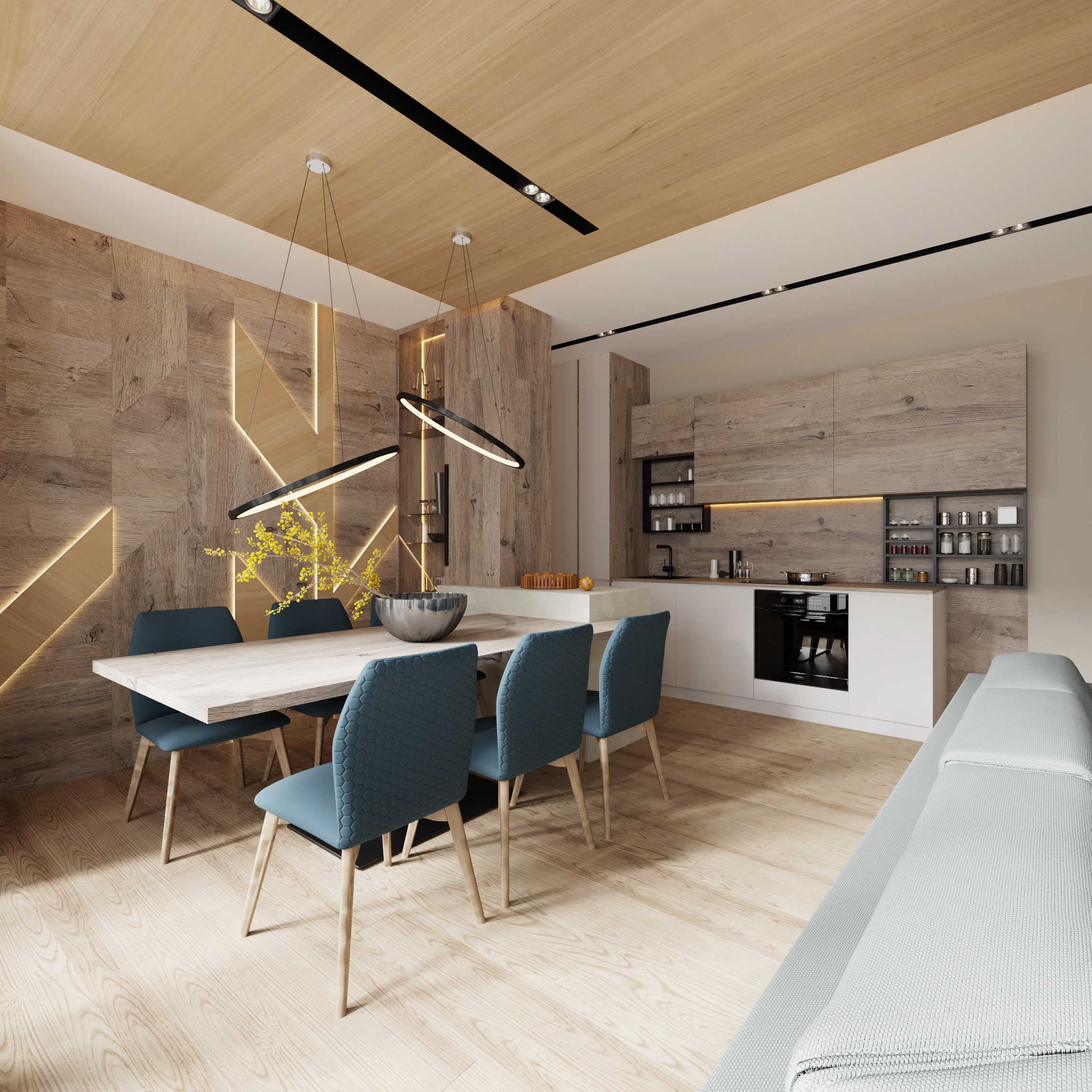 With the main goal, that the apartmentĀ becomes someone's home, incredibly cozy and comfy, the first thing that characterizes it's style is wood finishes, the natural tones, followed by wooden floor, walls and ceiling, fireplace and neural textile colors.