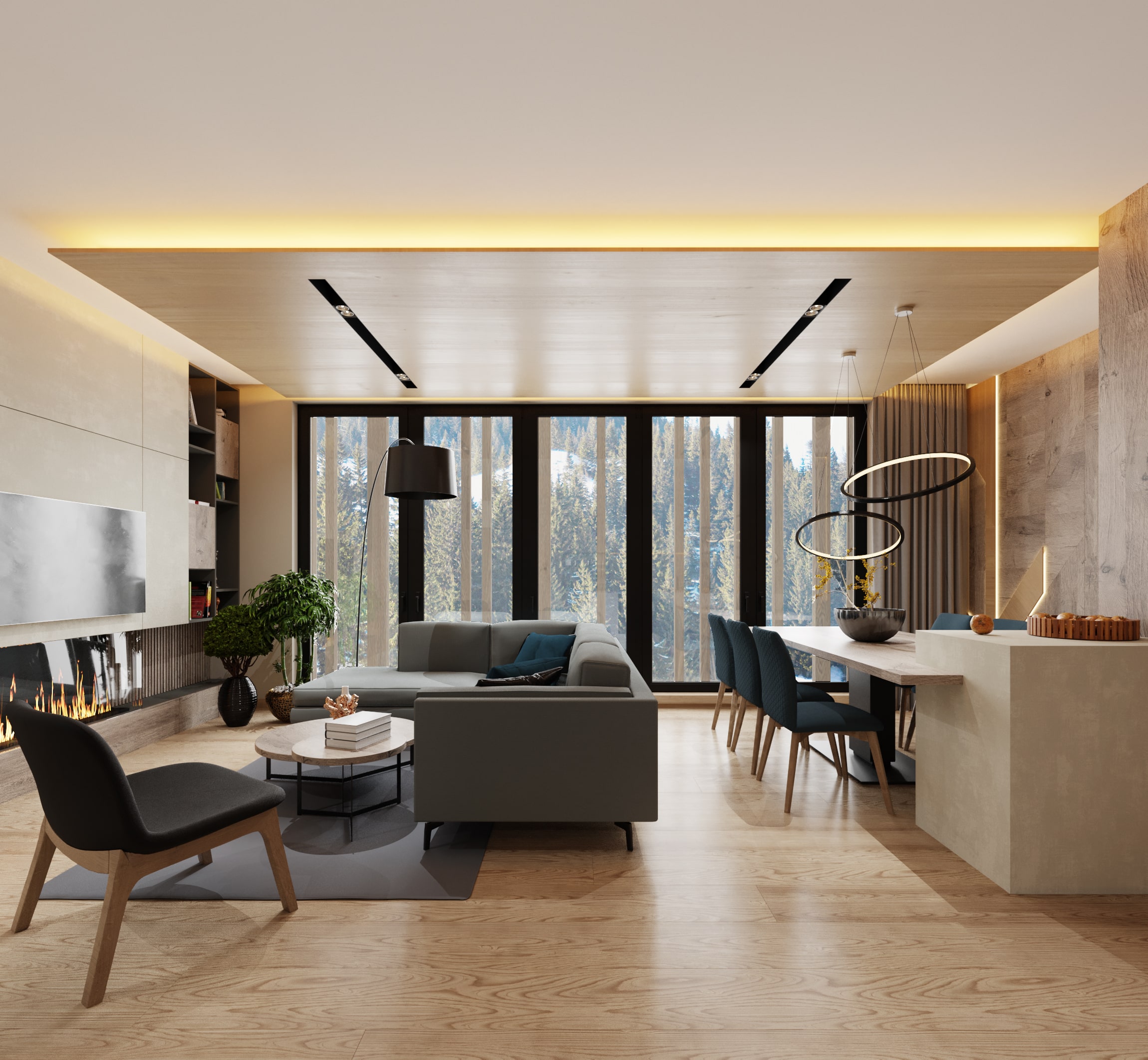 A1 apartment consists of: entrance hall with wardrobe, open-space living room with kitchen and dining area, two bedrooms with bathroom and master bedroom. The area of the apartment is 90 m2, and the view from all rooms is open to the ski slope. From interior there are visible vertical parts of the facade that resembles a forest.