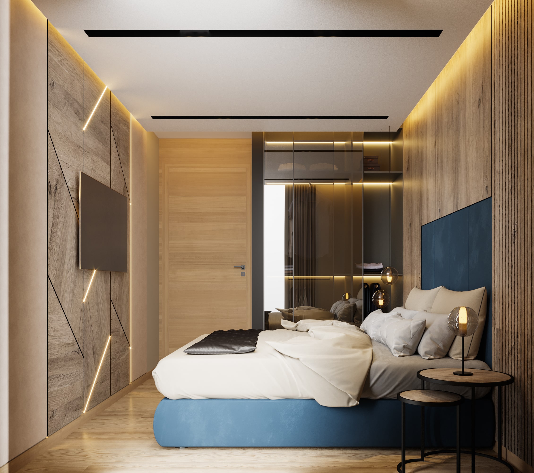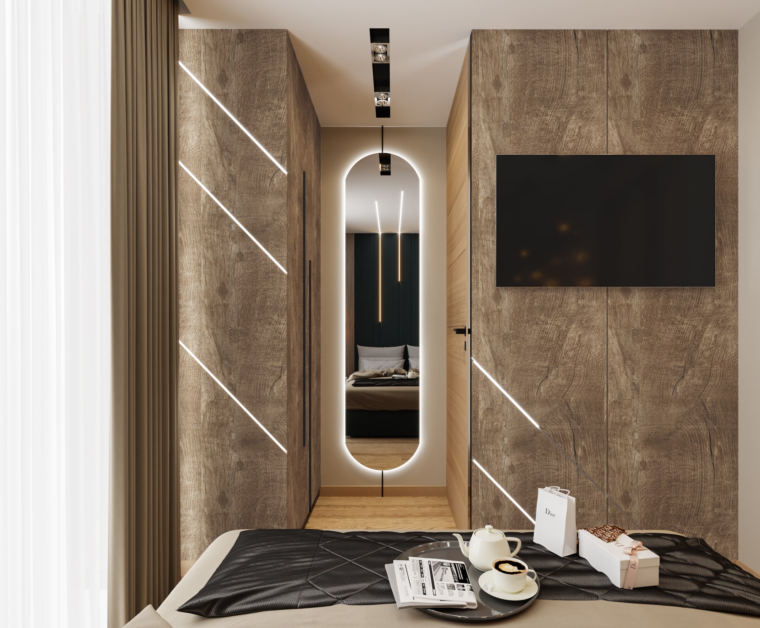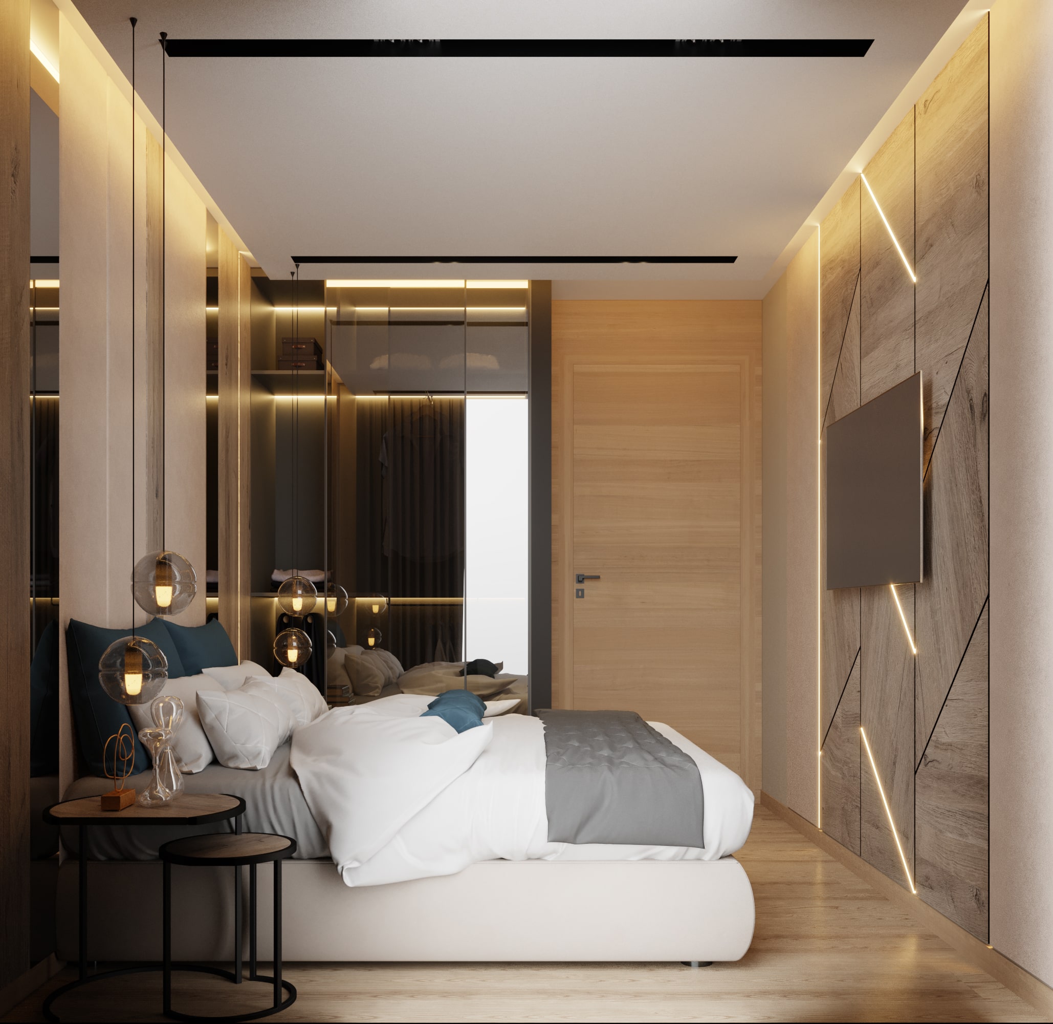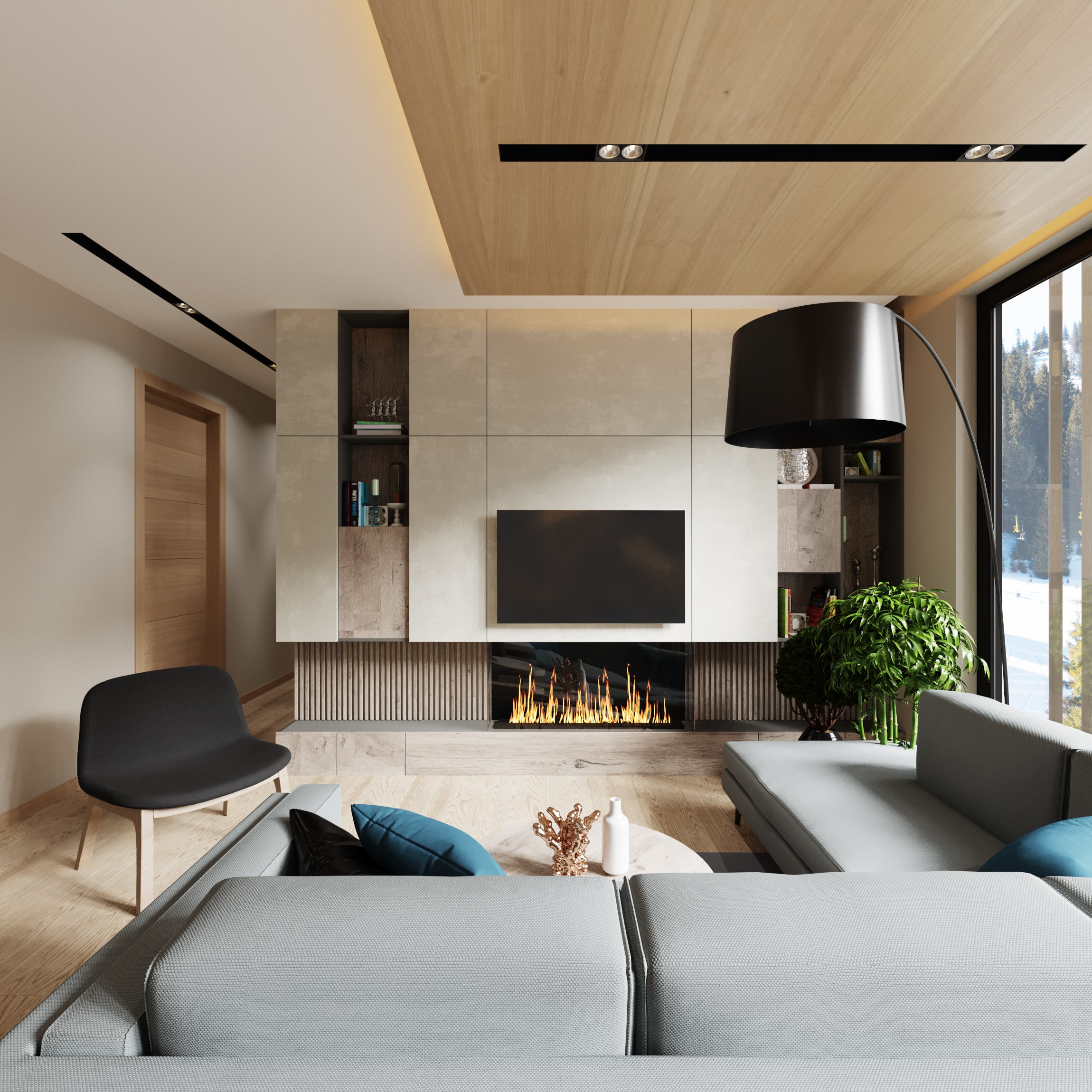 With the main goal, that the apartmentĀ becomes someone's home, incredibly cozy and comfy, the first thing that characterizes it's style is wood finishes, the natural tones, followed by wooden floor, walls and ceiling, fireplace and neural textile colors.